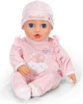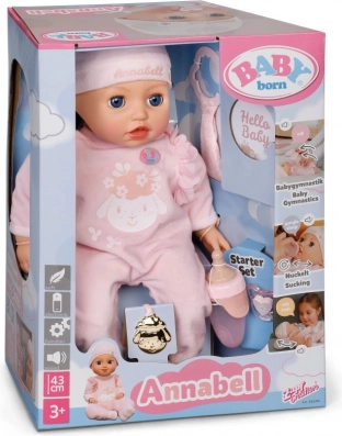 Annabell på 43 cm har et blødt krop, ideelt til at kramme og til blid leg. Den interaktive teknologi sikrer naturlige reaktioner – ved sut eller flaskefodring bevæger hun munden og lukker eller åbner øjnene alt efter situationen. Med beroligende vugning kan hun nemt vugges i søvn i to retninger.