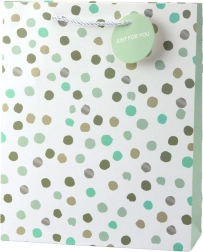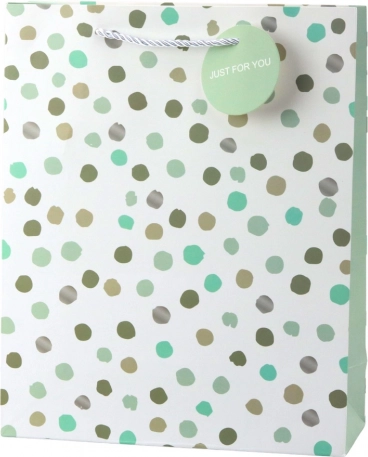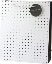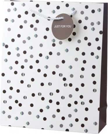 Elegant gavepose fremstillet af robust lamineret papir, hvilket sikrer holdbarhed og et æstetisk udtryk. Snoede snorehåndtag giver en behagelig og sikker transport, selv af tungere gaver. En dekorativ rund mærkat med teksten “Just for you” tilføjer et strejf af personlighed.