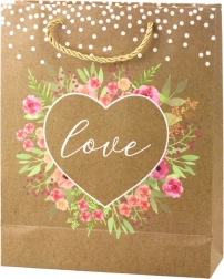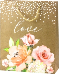 Denne gavepose prydes af en fin kombination af smukke, farverige blomster og teksten "Love". Små brokadeprikker øverst på posen giver et let og elegant udtryk.