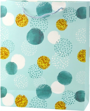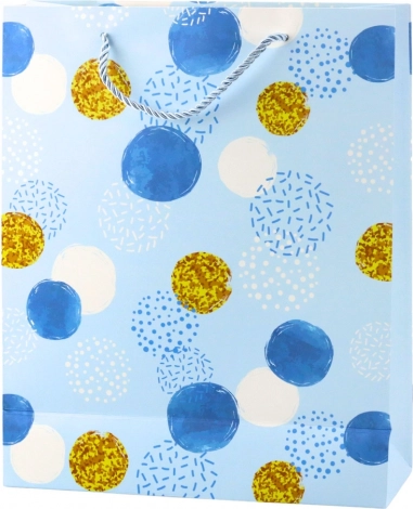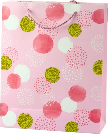 Prikker i forskellige størrelser, nogle med glitrende effekt eller dekorativt print, giver helheden et originalt og effektfuldt udtryk. Posen er lavet af holdbart lamineret papir, som er modstandsdygtigt over for bøjning, hvilket muliggør sikker indpakning selv af tungere gaver.