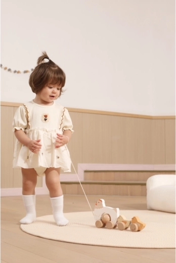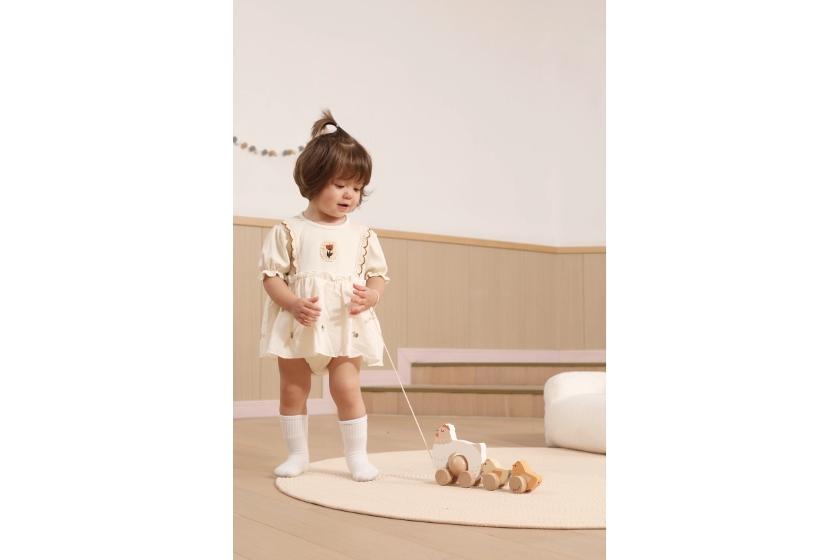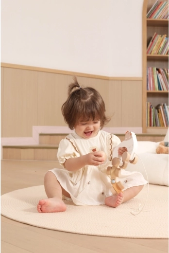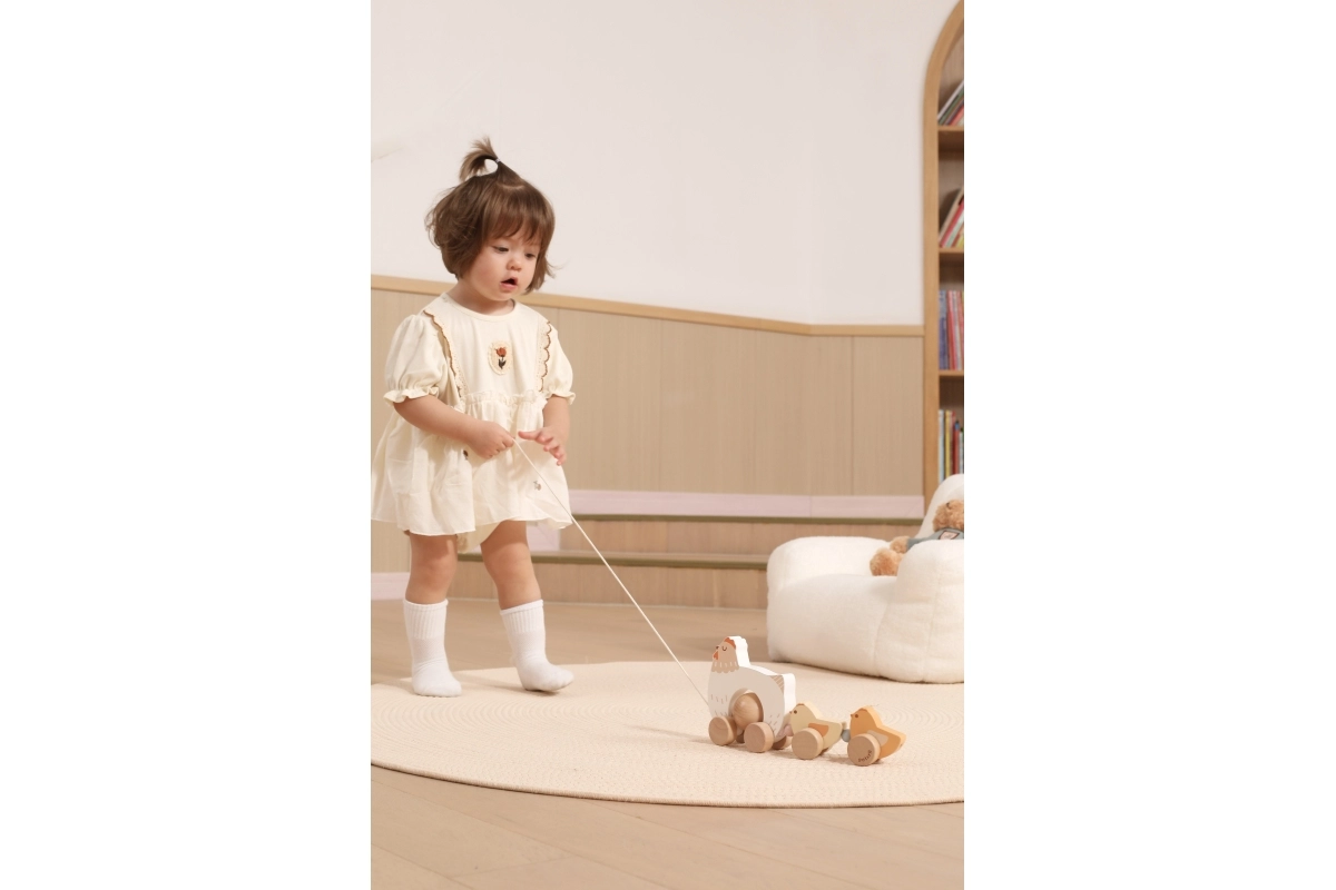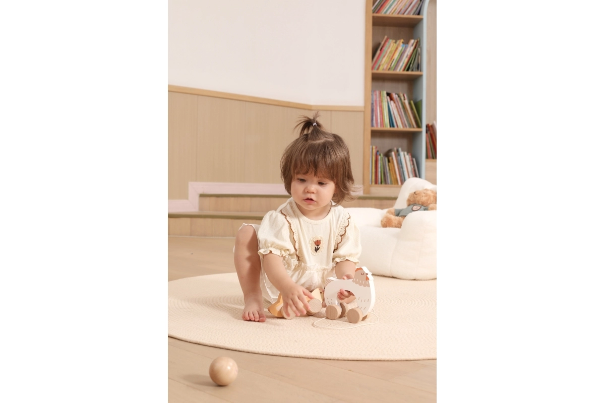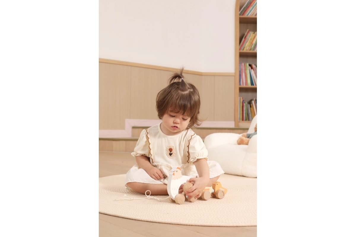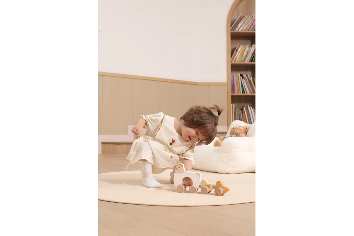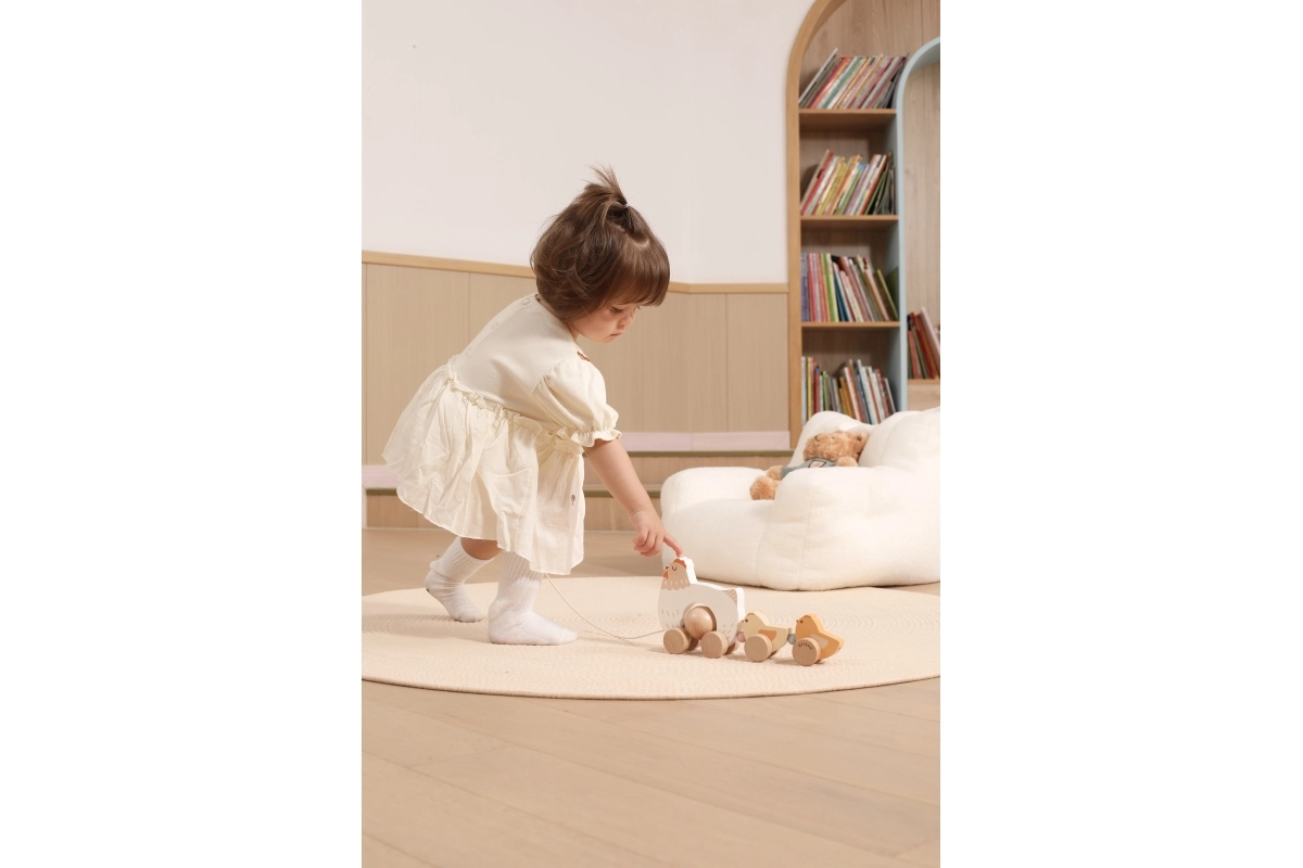 Når man trækker, gynger kyllingerne rytmisk og lokker børn til flere skridt – sjov og balancetræning i ét.