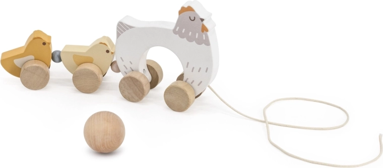 Legetøjet er lavet af kvalitetstræ med afrundede kanter for sikker brug. Neutrale natur- og pastelfarver passer perfekt ind i det moderne børneværelse. Takket være de glidende hjul og snoren trækkes hønen med kyllinger let hen over gulvet og bliver dermed en motivation til at gå.