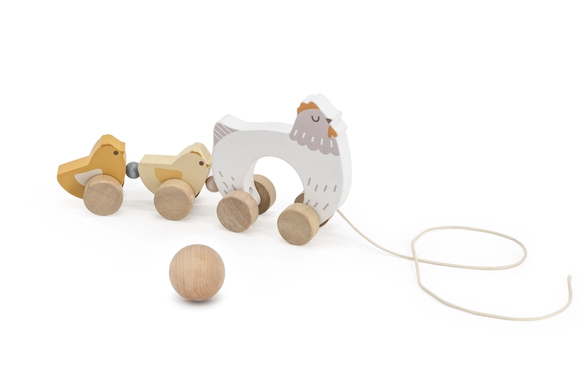 - trække-legetøj med snor, gyngende kyllinger, aftageligt æg