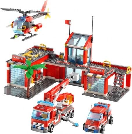 Brandstationssættet indeholder en to-etagers bygning med heliport, garager og glasdøre. I pakken finder du to redningskøretøjer – et stort med stige og et mindre støttefartøj – samt en redningshelikopter. Derudover indeholder sættet 6 brandmandsfigurer, som gør det muligt at skabe forskelligartede redningsscenarier.