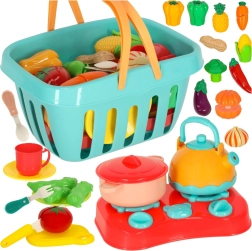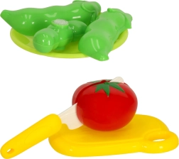 Dette rige sæt lader børn tilberede “måltider” af farverig frugt og grønt opdelt i dele, som sættes sammen med velcro. Leg med knive og tilbehør hjælper med korrekt greb, hånd–øje-koordination og introducerer naturligt navnene på madvarer.