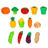 - Frugt og grøntsager med velcro (13 stk.): ærter i bælg, grøn peber, gul peber, chilifrugt, løg, broccoli, majs, tomat, ananas, græskar, aubergine, bønner, gulerod.