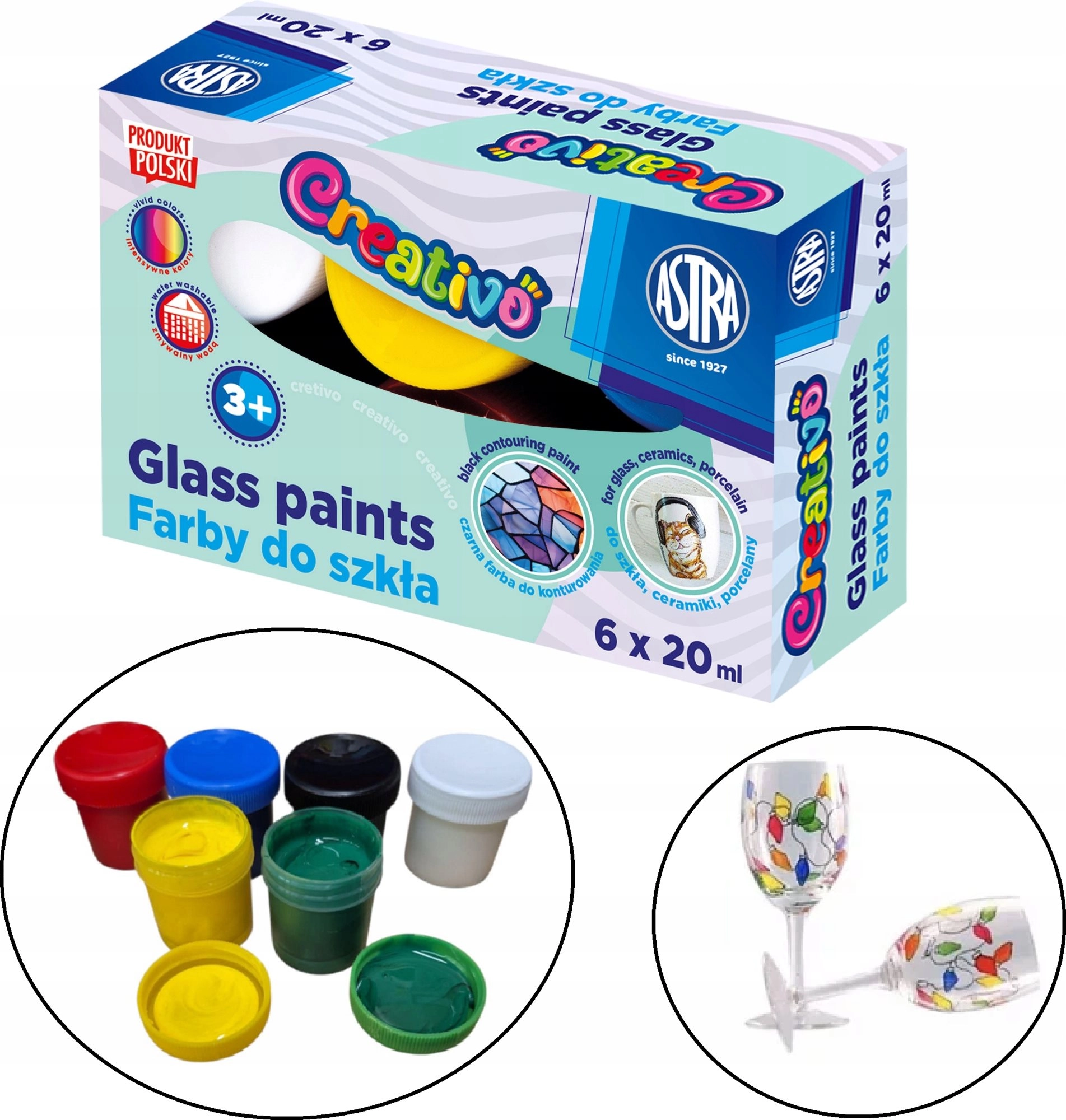 Opdag alsidige halvtransparente glasmalinger, som gør det let at skabe unikke dekorationer på krus, vaser, tallerkener og andre genstande i hjemmet. Sættet ASTRA CREATIVO tilbyder seks praktiske 20 ml tuber med intense nuancer til effektfulde, håndmalede motiver.