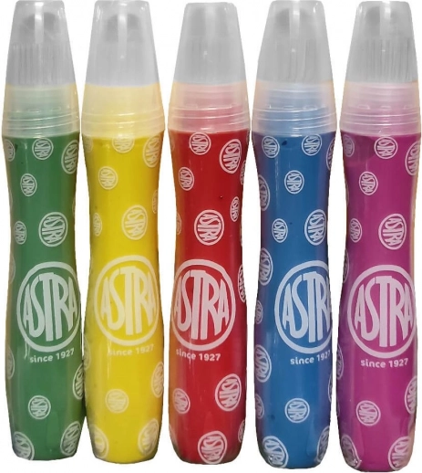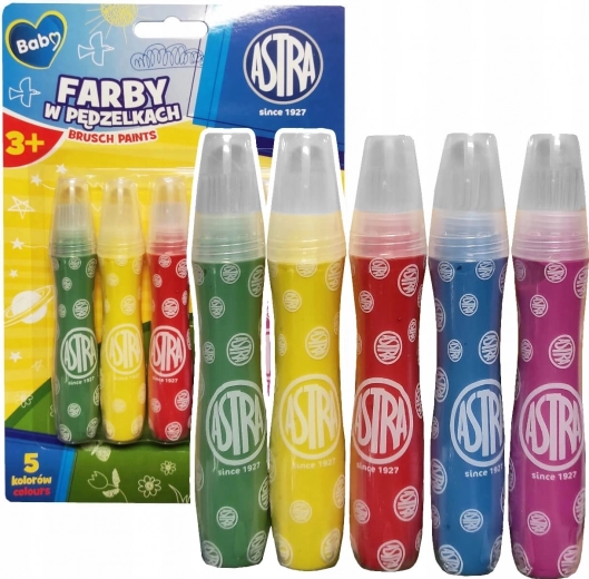 Ideel sæt til små kunstnere: ASTRA farver i pensler, 5 stk. Hver pensel indeholder allerede farve, så der er ikke behov for ekstra tilbehør. Nem brug ved tryk, sikker sammensætning og design til børn fra 3 år – perfekt til papir og karton.
