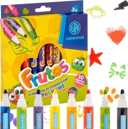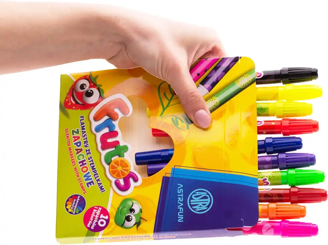 ASTRA duftende tuscher Frutos forvandler hver tegning til en sjov sanseoplevelse. Hver farve har sin egen behagelige frugtagtige duft, som understøtter børns kreativitet og gør tiden med tegning, farvelægning og dekoration endnu hyggeligere. Det dobbeltsidede design kombinerer en klassisk rund spids til glatte strøg og en stempelspids til hurtige dekorative motiver.