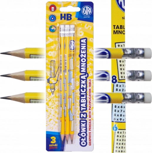 Sæt med 3 ASTRA HB-blyanter med trykt gangetabel og viskelæder. Ergonomisk trekantet skaft, 2,2 mm stift, træ fra bæredygtigt forvaltede skove. Ideel til skoleelever.