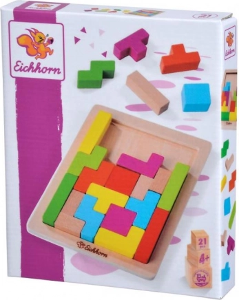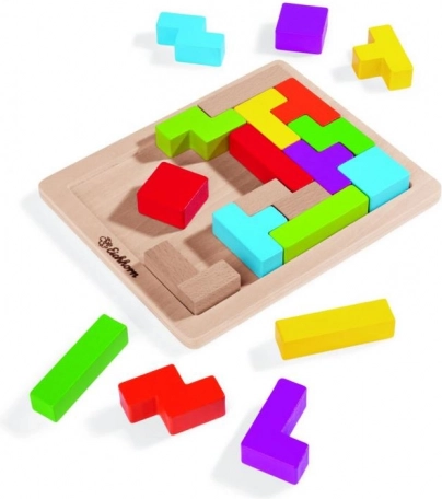 Klogt træpuslespil til 1 spiller, der fremmer finmotorik og logisk tænkning. Indeholder 20 farvede klodser af bøgetræ i 5 forskellige former samt en stabil plade af krydsfiner på 18 × 15 cm til præcis formlægning.