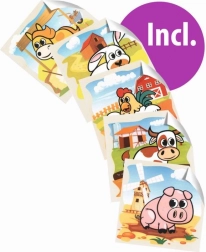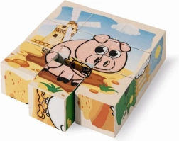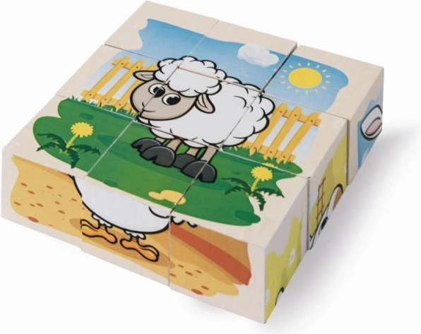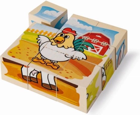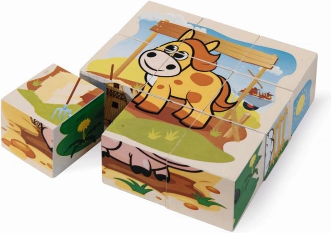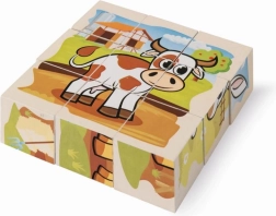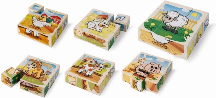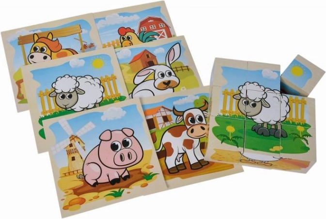 Saml seks søde billeder med bondegårdsdyr af ni træklodser. Sættet tilbyder 6 motiver og 6 forlæg for nem samling, er lavet af fyrretræ med FSC-certificering og måler samlet 10,5 × 10,5 cm.