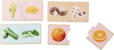 Træ-Montessori-puslespil med temaet frugt og grøntsager lærer børn at matche identiske brikker korrekt og at navngive de enkelte typer fødevarer. Realistiske illustrationer hjælper med at forbinde leg med hverdagen og støtter naturlig læring gennem leg.