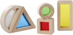 Sættet indeholder fire grundformer – trekant, rektangel, firkant og cirkel – suppleret med et stykke med spejlfolie. Takket være de kompakte mål ligger kuberne godt i selv de mindste hænder og er ideelle til fri leg, sortering og byggeri.