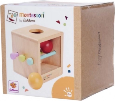 Montessori-boksen bygger på Montessori-pædagogikkens principper: barnet lægger kuglen i åbningen, observerer dens bevægelse og lærer koncentration og tålmodighed. Indsatte pinde spærrer midlertidigt passagen, så de små opdagere kan afprøve, hvad der sker, når de fjernes. Uden pinde er aktiviteten lettere og ideel til yngre børn.