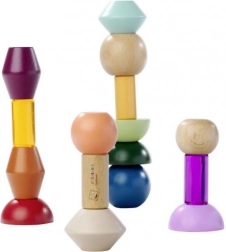 Disse særlige geometriske klodser kræver en smule fingerfærdighed og motiverer fantastisk til koncentration. Af de farvede dele kan børn genkende og samle 5 nye former, mens de gennemsigtige akrylsten giver bygningerne en interessant kontrast.
