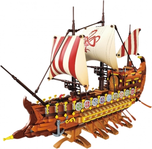 Den troværdigt udformede model, inspireret af antikke krigsgalejer, leverer både autentisk udseende og byggeoplevelse. Du finder lange rækker af årer, realistiske master med sejl, dekorative skjolde langs skrogets sider og et markant modelleret dæk med udrustningselementer. Byggesættet udvikler tålmodighed, koncentration og finmotorik og vil med sin gennemtænkte konstruktion glæde selv krævende modelbyggere.