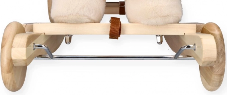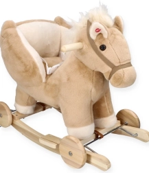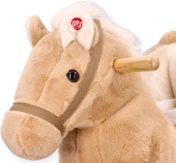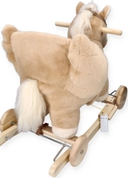 Den beige gyngende hest Pegas med sæde forener charmen ved en traditionel legeting med praktiske elementer til det moderne hjem. Barnet kan bruge hesten på klassiske træmeder eller skifte til kørsel på gulvet takket være hjulene. Sædet er i en højde på cirka 35 cm ved brug af hjul og 31 cm ved gyngning på meder, hvilket er ideelt til førskolebørn.