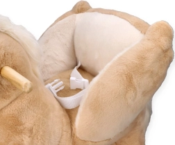 Strømforsyningen sikres af to AA-batterier, som er sikkert opbevaret i en lomme under hestens mave. Legetøjet opfylder CE-standarder og tilbyder en stabil konstruktion, et behageligt sæde og underholdning i mange timer.