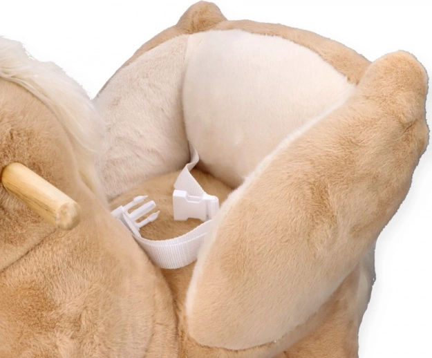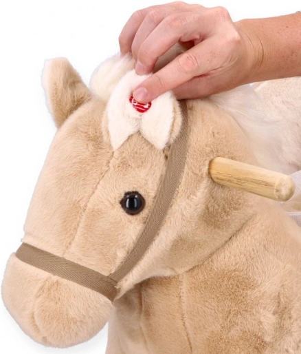 Beige gyngende hest Pegas med sæde og hjul. Sædehøjde 31–35 cm, strøm 2× AA, batterilomme under maven, CE-certificeret.