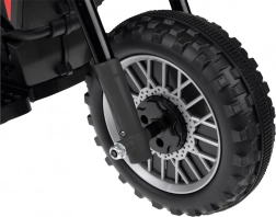 De massive hjul med dæmpningsbånd mindsker støj og vibrationer på hårde eller ujævne overflader. Den elektriske bremse aktiveres automatisk, når gaspedalen slippes, hvilket er ideelt for begyndere. Nem på- og afstigning styrker barnets selvstændighed og gør både korte og længere ture lettere.