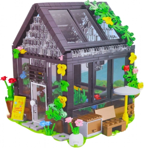 Byggesæt mini drivhus med 588 dele. Gennemsigtigt tag, blomster og havescene. Fantastisk dekoration og gave til børn fra 6 år og voksne.
