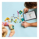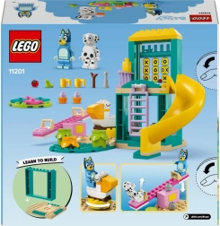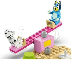 Dette legesyge byggesæt med legepladstema giver børn fra 4 år masser af muligheder for fri leg og byggeri. De to figurer – Bluey og Plet – kan suse ned ad den gule rutsjebane, gynge, lege på den lyserøde vippe-gynge, klatre op ad stigen og udforske omgivelserne fra tårnet med teleskop. Sættet rummer også en rund platform med legeelementer, en minipicnic med kopper og cupcakes samt små planter til at hoppe over.