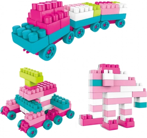 Dette pastelsæt i nuancer af lyserød, hvid, turkis og sart grøn vil glæde enhver lille bygger. Børn kan nemt bygge huse, dyr, køretøjer med hjul og originale 3D-konstruktioner. De større dele er lette at gribe om, og den sikre konstruktion uden skarpe kanter sikrer tryg leg.