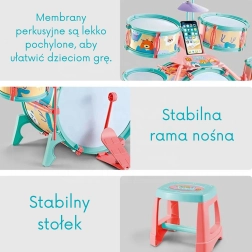 Oplev glæden ved musik med WOOPIE børnetrommesættet – et farverigt og interaktivt sæt designet til små musikere. Det er sikkert, holdbart og fyldt med funktioner, der understøtter kreativitet, koordination og udvikling. Takket være let plast er det nemt at vedligeholde og sikkert at spille på, mens livlige farver og eventyrlige motiver inviterer til leg fra første slag.