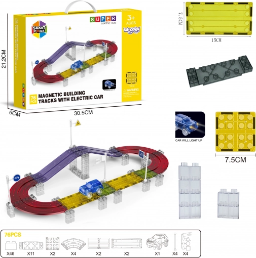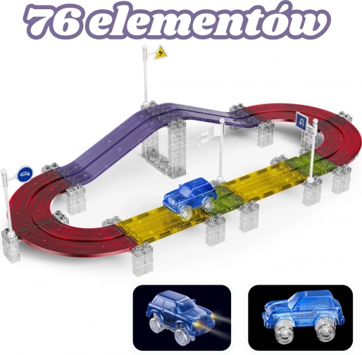 Oplev et byggesæt, der vokser med dine børns fantasi. De magnetiske elementer klikker hurtigt og sikkert sammen og gør det muligt at skabe broer, ramper og skarpe sving uden værktøj. Takket være den LED-underbelyste lille bil er kørslen spændende selv i mørke.