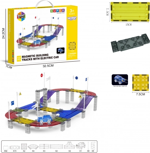 Den magnetiske racerbane WOOPIE forvandler legen til et fantastisk eventyr fuld af lys og farver. Takket være de let sammenkoblelige magnetiske dele kan børn selv bygge forskellige flerniveaubaner, hvor et lysende LED-minibil kører. Gennemsigtige farvede elementer sikrer masser af glæde både dag og aften.