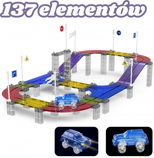 Oplev den kreative verden med WOOPIE byggesæt-banen, som understøtter fantasi, kreativitet og logisk tænkning. De magnetiske dele fæstner sig hurtigt og stabilt, så børn fra 3 år kan klare monteringen uden værktøj. Farvede, gennemsigtige elementer kombineret med et LED-minibil skaber et fængende lysshow.