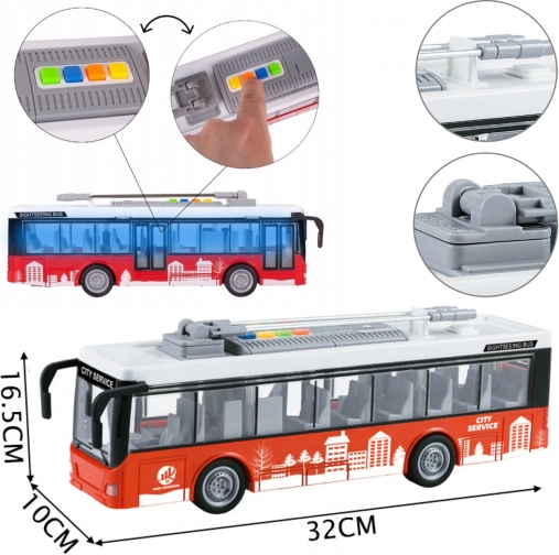 Den realistiske model af en by-trolleybus fra mærket WOOPIE vil glæde alle små trafikfans. Den tilbyder lys- og lydeffekter, åbningsbare døre, bevægelige pantografer og friktionsdrev til kørsel frem og tilbage. Et fremragende valg til kreativ leg og læring om offentlig transport.