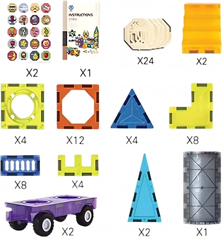- 4× firkant med huller, 12× ottekant, 4× trekant, 8× L-formet del, 24× kort med klistermærker/billeder, 2× aflangt rektangel (“mursten”), 8× firkant med gitter, 4× trekant med halvcirkel (trin), 2× chassis med hjul, 2× høj trekant (tårn), 1× cylinder (tag), 2× ark klistermærker, 1× manual/STEAM-guide
