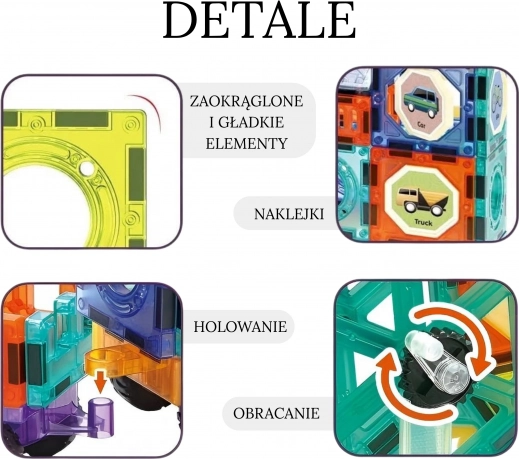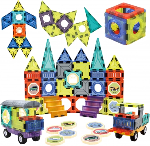 Dette kreative magnetiske byggesæt er ideelt til børn fra 3 år. Takket være de stærke magneter opstår der stabile konstruktioner fra simple flade modeller til avancerede 3D-byggerier. De gennemsigtige farvede dele indbyder til at udforske former og farver og støtter læring gennem leg.