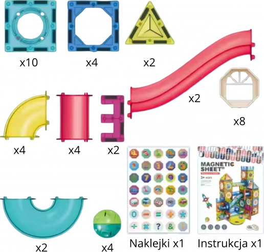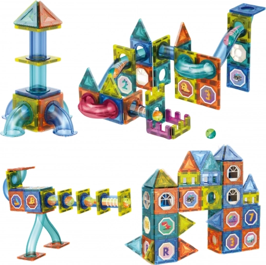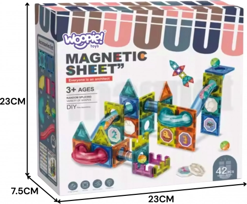 Sættet indeholder 42 komponenter, herunder magnetiske fliser og formede bane-sektioner, som gør det muligt at skabe varierede, stabile og underholdende konstruktioner. Delene kobles let og sikkert sammen ved hjælp af kraftige magneter, så selv mere dristige projekter kan lade sig gøre.