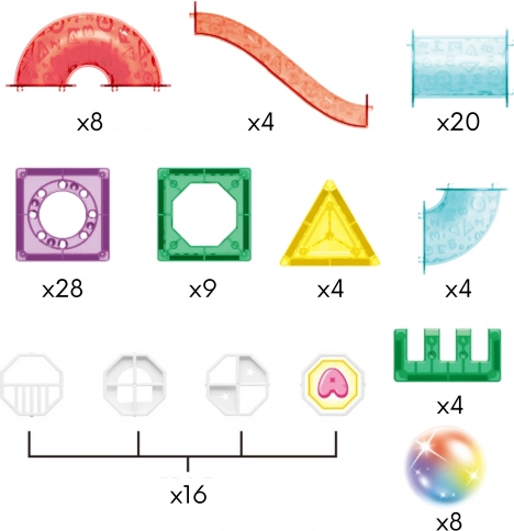 Sættet indeholder lysende kugler og udvalgte dele, som giver en effektfuld visuel oplevelse i mørke. Med de mange forskellige formede dele (tunneler, sving, lige stykker, U-elementer) prøver børn konstant nye kombinationer, lærer om årsag og virkning og opdager tyngdelovens principper.