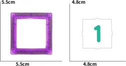 - 8 blå kvadrater, 7 røde kvadrater, 9 grå kvadrater, 7 lilla kvadrater, 9 grønne kvadrater, 30 pædagogiske kort med tal