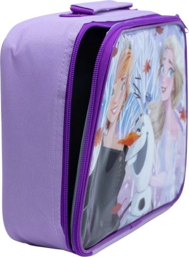Frozen termotaske til madpakke med isolerende lag, 1 stor lomme, metallynlås og navneetiket. Praktisk hank, ideel til skole og udflugter.