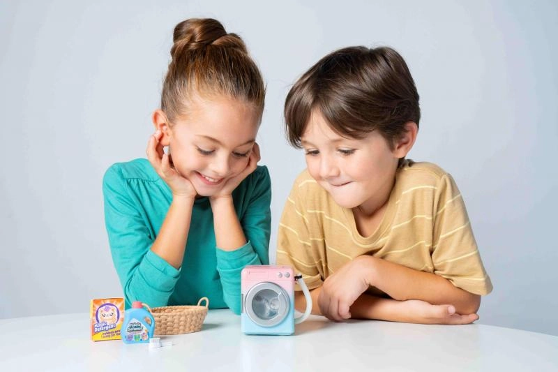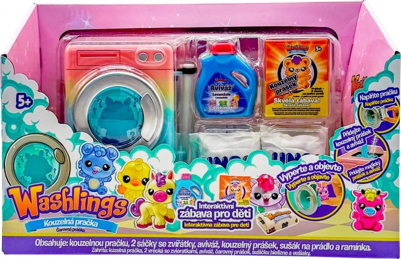 Forvandl vasketid til et magisk ritual! Washlings mini-vaskemaskinen med åbnelåge, roterende tromle og slange til udtømning giver børn en realistisk, men sikker rolleleg i hjemmet. I æsken finder du en “beskidt” pose – efter vask afsløres et overraskelsesdyr og et blødt håndklæde, som kan hænges på det lille tørrestativ.