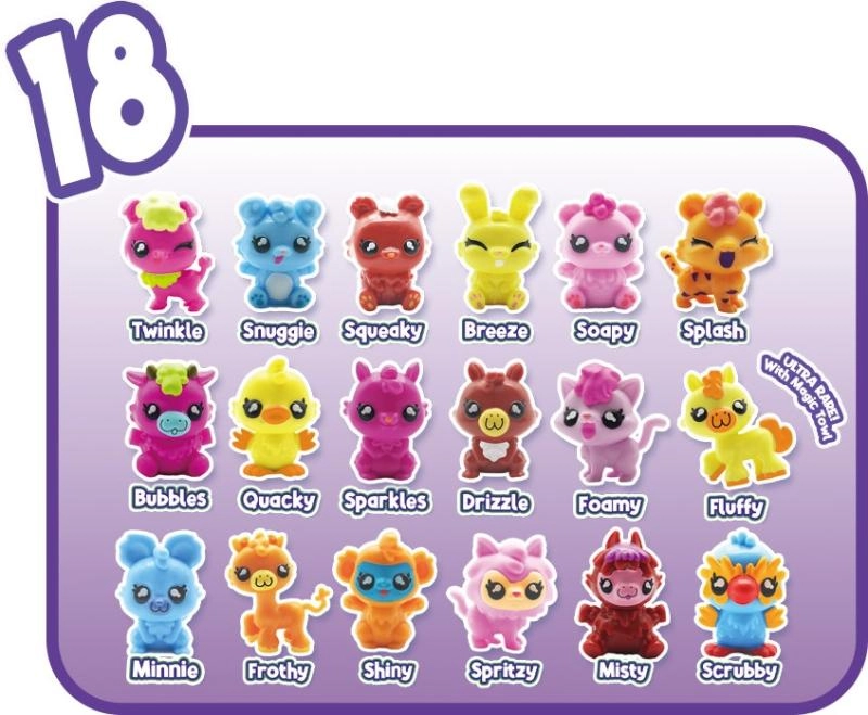 En kollektion med 18 søde dyr venter, hvoraf ét er ultrasjældent med et særligt håndklæde. Hver vask er en ny oplevelse, som styrker fantasien, finmotorikken og rolleleg. Dyret kan ikke vælges – overraskelsen varer helt til sidst!