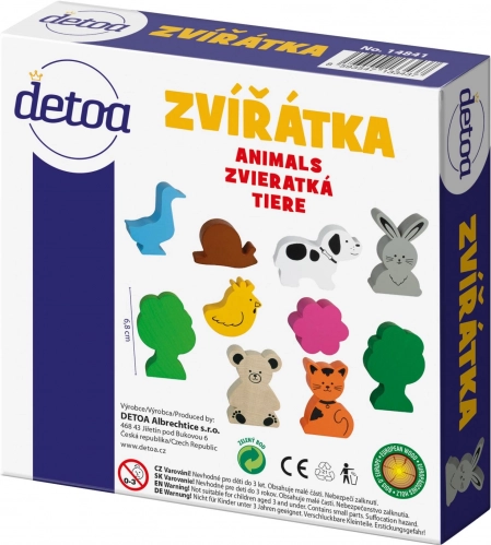 Opdag kreativ leg for børn med et sæt på 10 kvalitets trædyr i en praktisk æske. Nogle figurer har et naturligt udseende, andre er farvede og trykte. Perfekt til udvikling af fantasi, finmotorik og fri leg. Kan kombineres med produkter fra DETOA. Ikke egnet til børn under 3 år.
