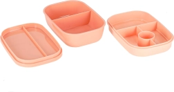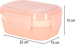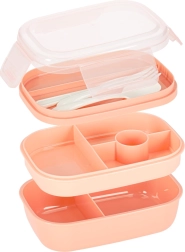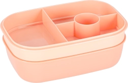 Den tredelte konstruktion med 8 ruminddelere gør det muligt at pakke hovedret, tilbehør og snack hver for sig. Fire clips lukker låget med silikonepakning sikkert, så indholdet forbliver trygt – også i tasken. Den abrikosfarvede nuance giver et moderne udtryk.