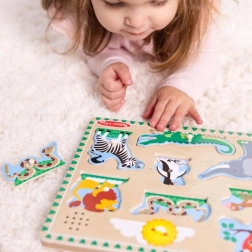 Disse kvalitets lydpuslespil i træ giver både glæde og læring. Når en brik placeres korrekt, afspilles den tilsvarende lyd, for eksempel en bil eller et dyr, hvilket styrker forståelsen af sammenhænge og motiverer børn til videre udforskning.