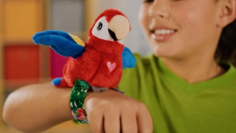 Den søde røde papegøje STEPPOS Happy Yappers sættes på håndleddet og sørger for timevis af sjov. Den gentager, synger en fuglesang og basker med vingerne – den perfekte ledsager for både børn og dyreelskere.