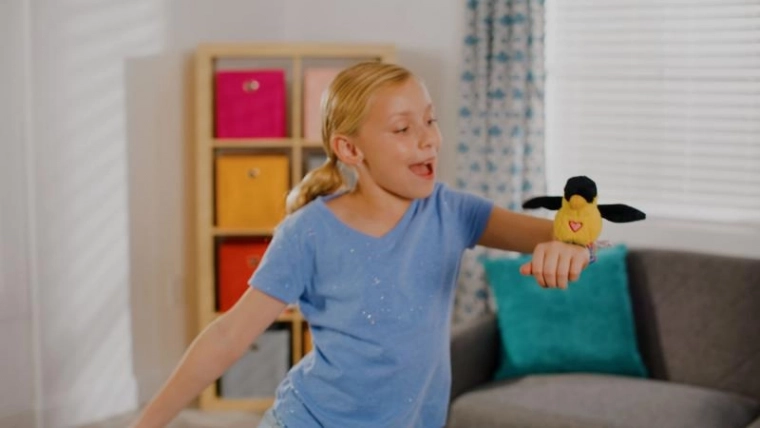 Denne glade, interaktive lille fugl begejstrer børn med sine lyde og bevægelser. Når den er klipset på håndleddet, bliver den din makker, som reagerer på stemmen, gentager simple ord og synger sin egen melodi. Takket være de viftende vinger virker den levende og trækker børn ind i legen.