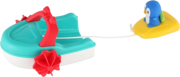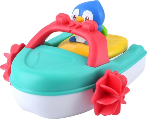 Sjov badelegetøjsbåd til de mindste: en båd med en pingvin, som bevæger sig af sig selv efter optræk takket være sidepadler. Flyder på vandet, har optræksdrev og et farverigt, sikkert design ideelt til både badekar og pool.