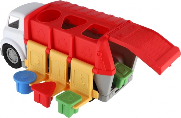 Denne farverige skraldebil vil begejstre små fans af oprydning og genbrug. Toppen fungerer som en formsorterer med huller, hvor børn matcher de rigtige klodser og lærer at genkende former og farver. Åbningsbare sidedøre og aftagelige spande gør det sjovt at efterligne indsamling af affald.