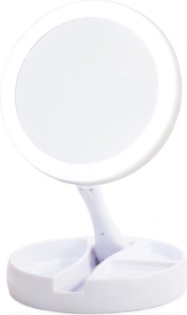 Elegant bordsspejl med LED-belysning og dobbeltsidet spejl (1× og 10× forstørrelse) er ideelt til makeup, hudpleje og isætning af linser. Takket være den 180° roterende konstruktion skifter du nemt side, mens den praktiske organizer i basen holder kosmetik lige ved hånden. Strømforsyning via 4× AA-batterier eller MicroUSB-kabel for maksimal bekvemmelighed.