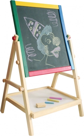 Denne træ-tavle er dobbelt-sidet og multifunktionel – perfekt til daglig leg og læring. Børn kan øve skrivning, tegning og de første regnestykker på den magnetiske hvide side med dry erase eller skabe med kridt på den traditionelle sorte side. Takket være den rumlige hylde er alle redskaber altid lige ved hånden.